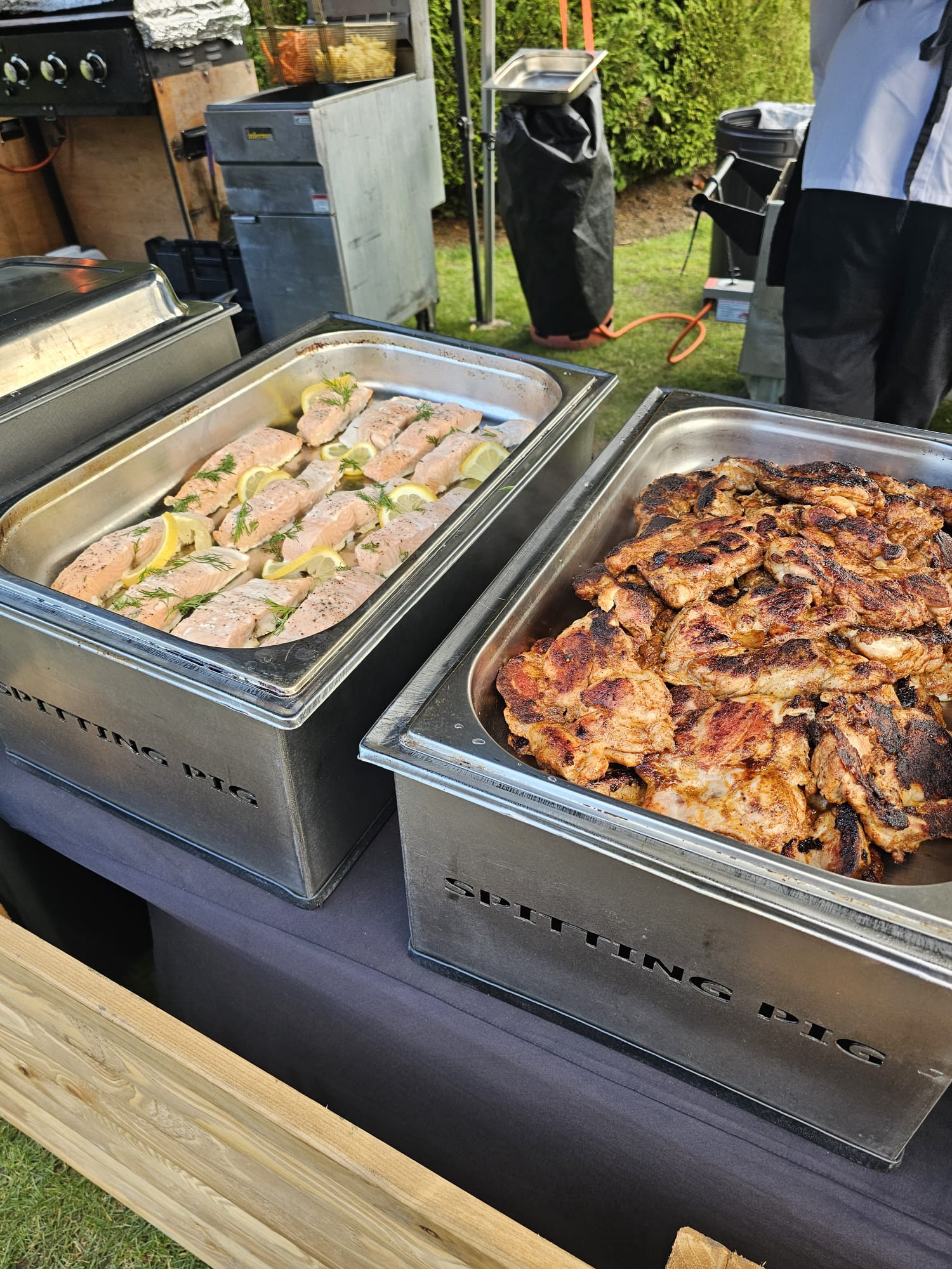 crackling crisped up beautifully while the stuffing soaked up all those rich, savoury juices. Alongside it we made sure there was something for everyone in the form of whole roasted salmon for 9 guests, halal chicken thighs for 24 people and grilled vegetable skewers with halloumi, flatbreads and tzatziki for the plant-based crowd.